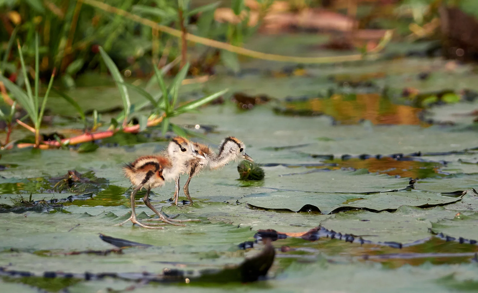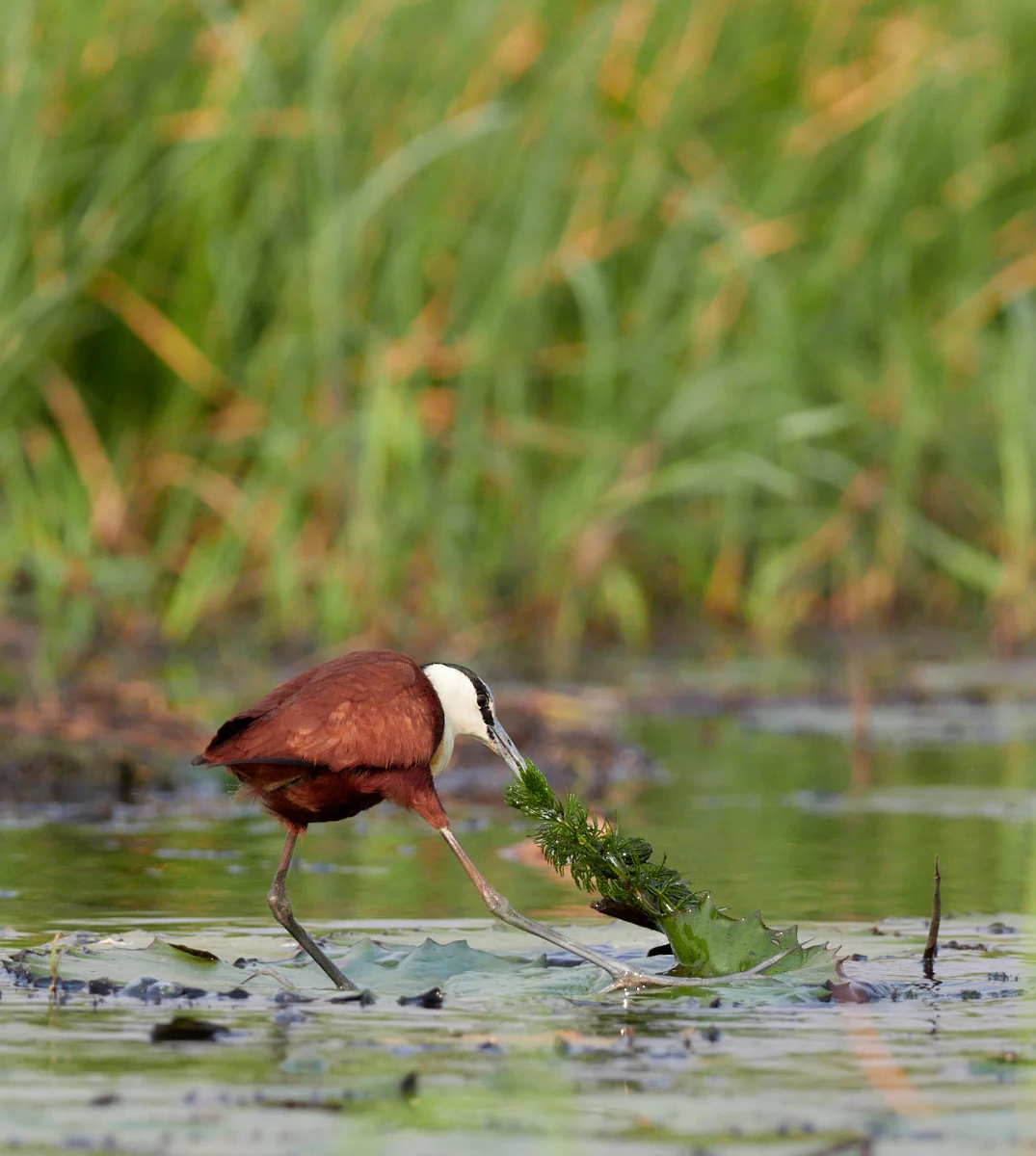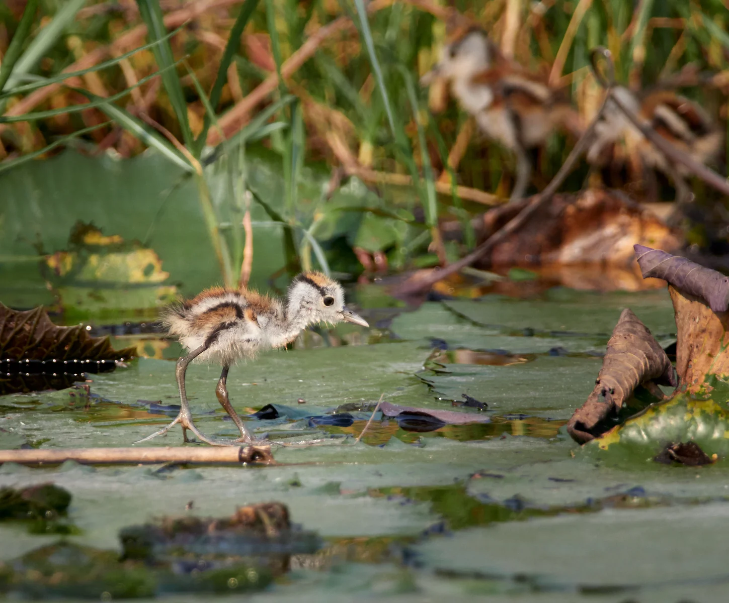 We had some entertaining sightings of African Jacanas, known as the ‘Jesus Bird’ for their gravity-defying abilities to walk on water (lily-pads, actually) aided by their spectacularly huge feet. They pull around surface vegetation to disturb insects and other small water creatures as prey. We were lucky also to have some prolonged sightings of their charmingly ungainly chicks.