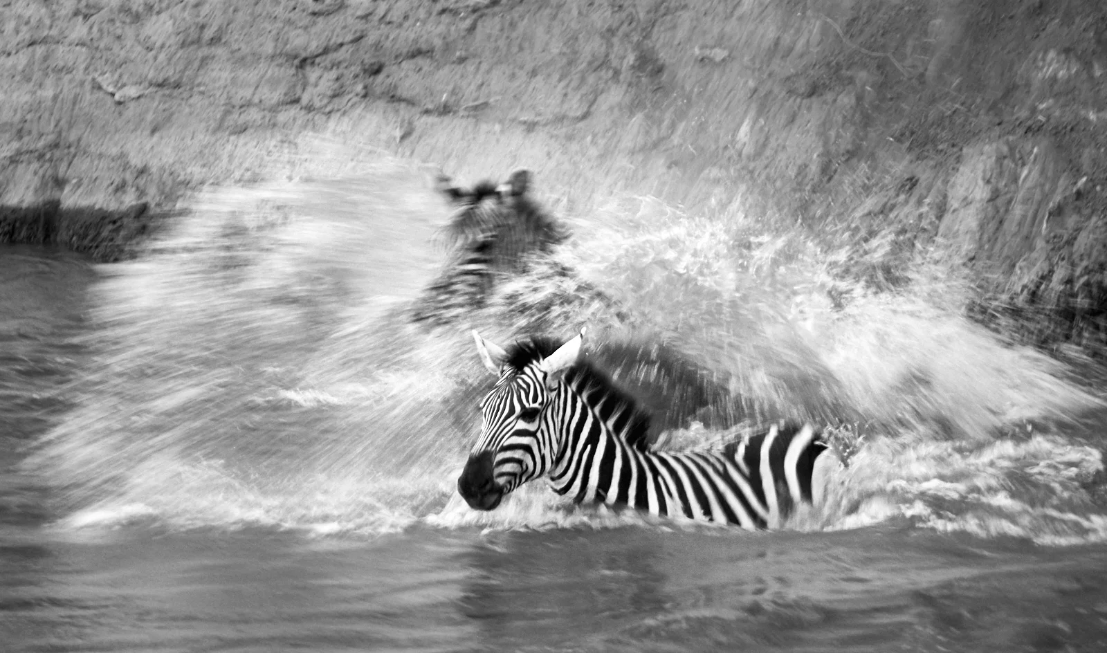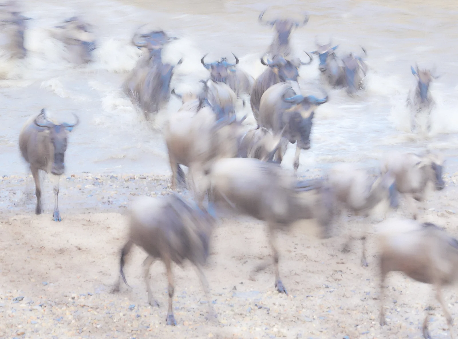 The banks at the major crossing points are eroded and sandy, which results in wonderful clouds of dust enveloping the descending and milling creatures, with horns, legs and stripes looming through the gloom during descents and ascents. Low, early morning light gives added beauty to such scenes.