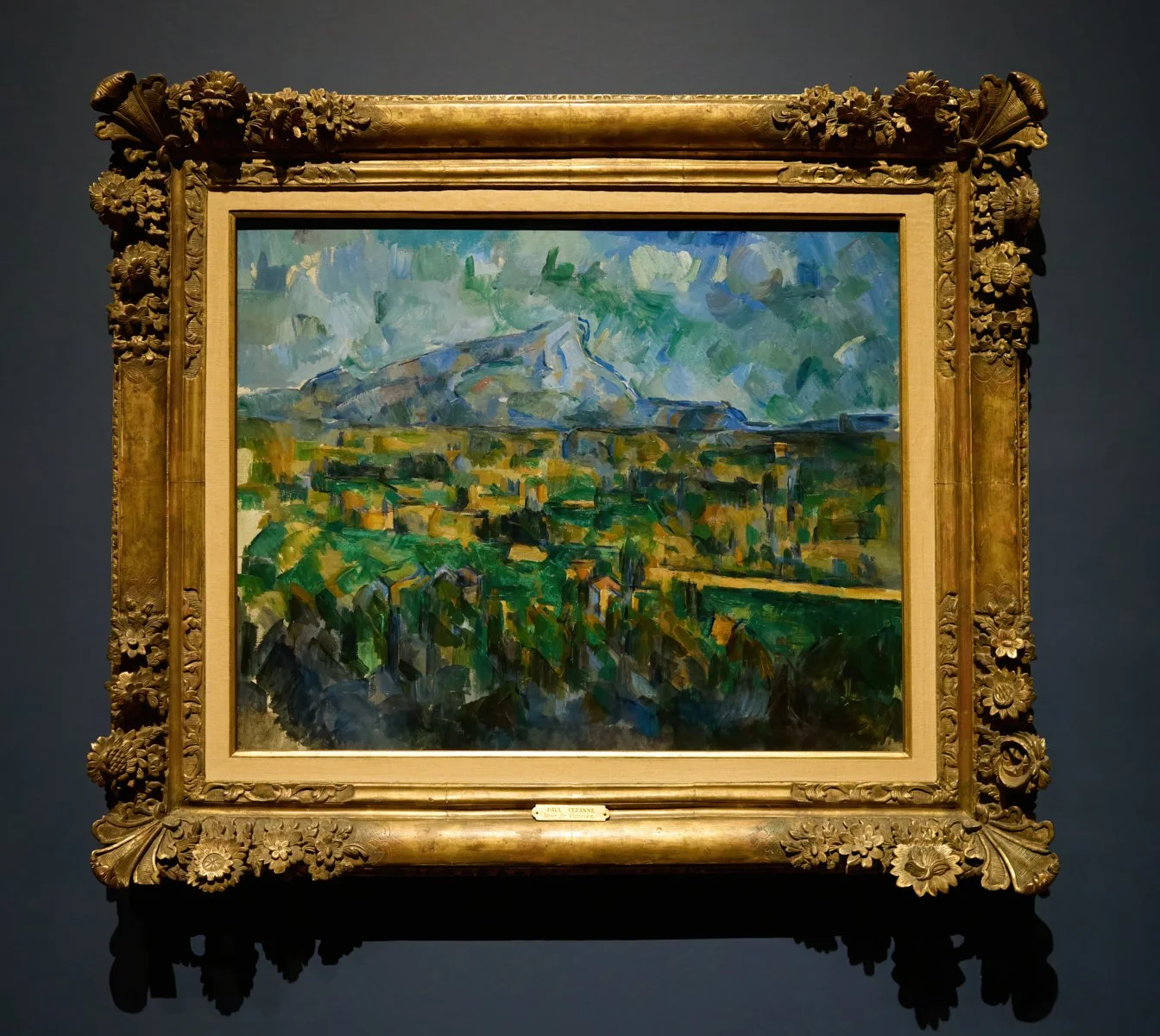 Another room concentrated on his favourite landscape subject, the peak of Mont Sainte-Victoire rising behind Aix-en-Provence. I loved the way he built up a detailed whole from an apparently random cacophany of brush strokes, as I’ve tried to illustrate by pulling back from a couple of examples here…