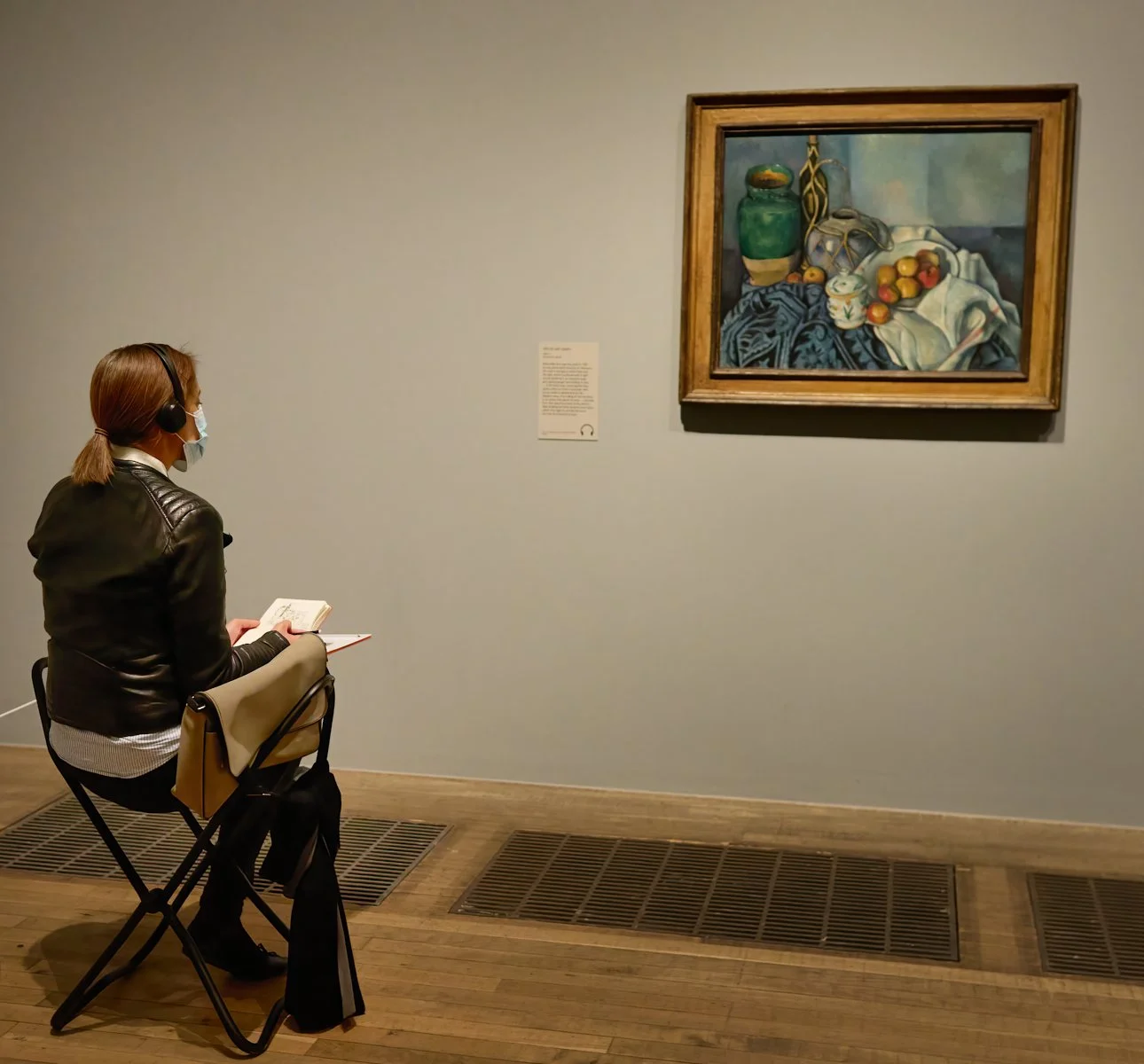 This doesn’t translate well to the photograph (or to reproductions on the web, for example: https://static.greatbigcanvas.com/images/singlecanvas_thick_none/getty-images/still-life-with-apples-by-paul-cezanne,2144833.jpg?max=800 ), so I strongly urge anyone interested to go to see the original (the exhibition runs until March 12th).