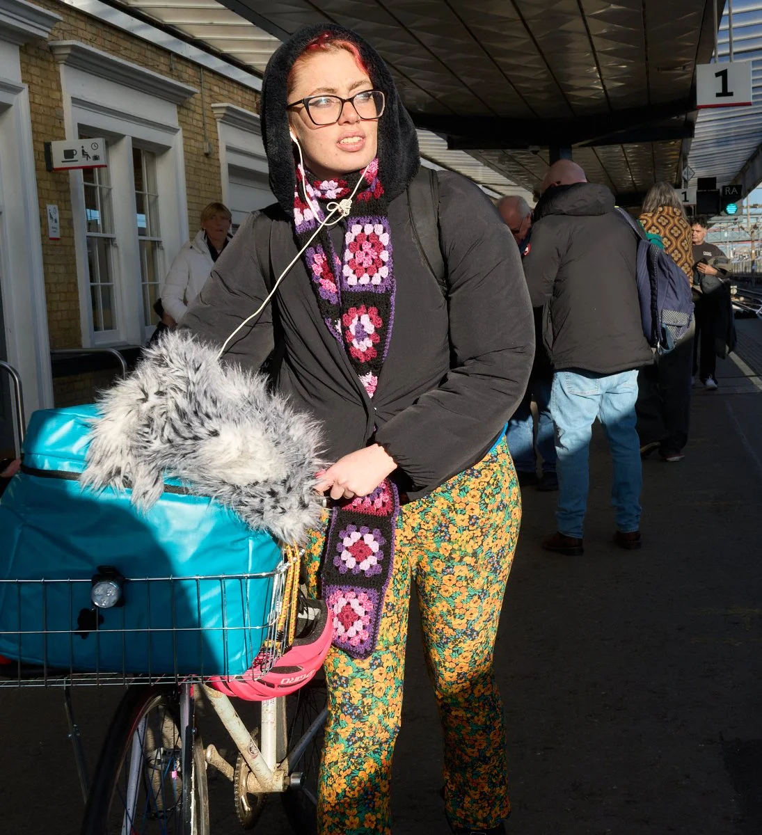 A colourfully dressed traveller on the platform, and of course with a bike.